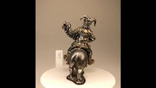 Сделанная полностью вручную и обработанная методом чернения по олову, миниатюра изображает скомороха с гармошкой верхом на свинье.